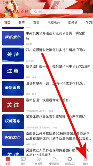 1、打开云上南部,点击底部导航栏的我的,进入个人中心页面。