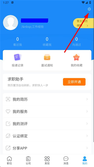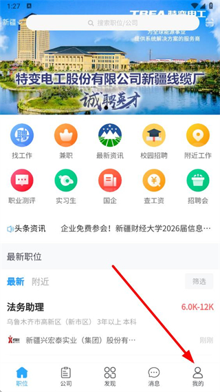 1、在新疆人才网app职位页面点击我的选项,进入个人页面。