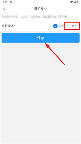 4、在隐私号码设置页面选择开启隐私号码,点击保存按钮,即可隐藏个人号码。