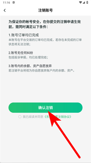 5、确认满足注销条件,勾选后,点击确认注销,完成账号注销。