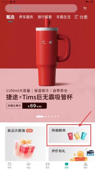 2、在商城页面,点击热销榜单选项,浏览热销好物列表。