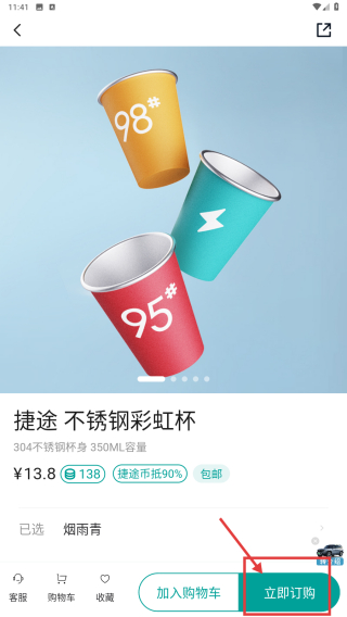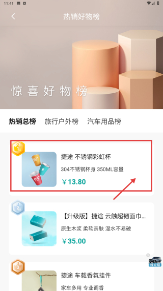 3、在热销好物列表里,找到捷途不锈钢彩虹杯商品条目,点击进入商品详情页。