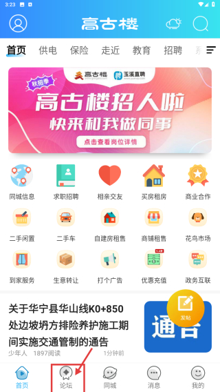 1、打开本地生活类应用,点击底部论坛选项,进入社区页面。