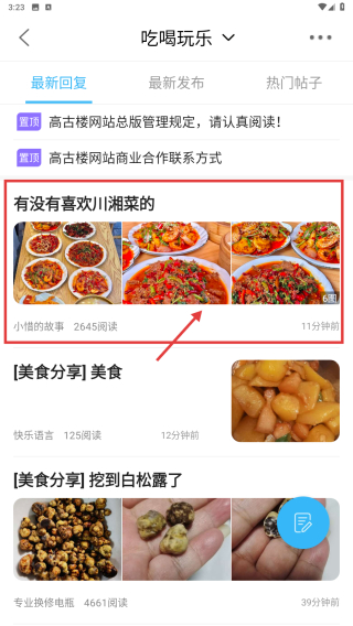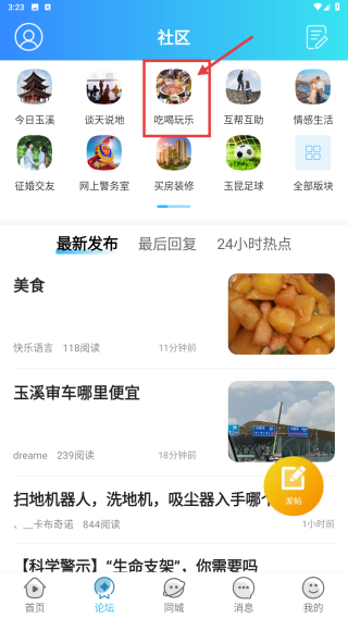 2、在社区页面,点击吃喝玩乐板块选项,浏览该板块下的帖子列表。