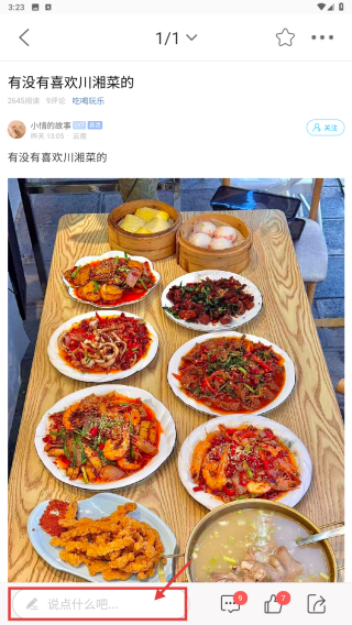 4、在帖子详情页,点击说点什么吧...输入框,即可参与帖子互动。