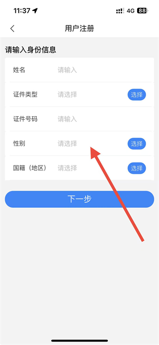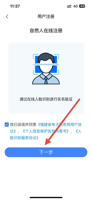 3、在用户注册页面勾选已阅读并同意相关协议,点击下一步。