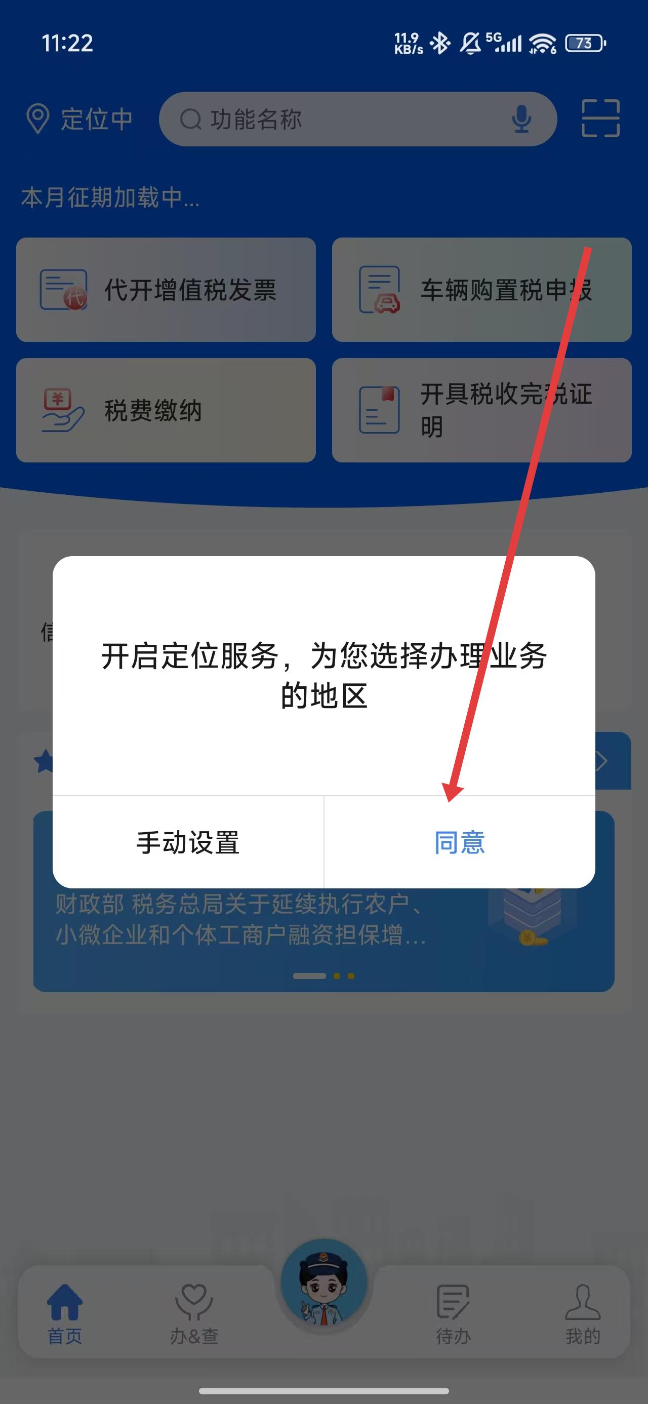1、在进入到电子税务局app后,点击同意按钮开启定位服务后使用app。