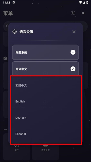 3、语言设置页面展示多项语言,如繁體中文、English、Deutsch、Español等。