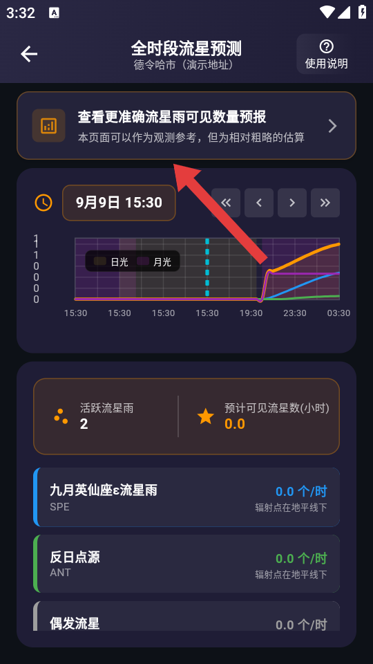 2、在功能菜单的流星与彗星区域,点击今夜流星雨,进入全时段流星预测页面。