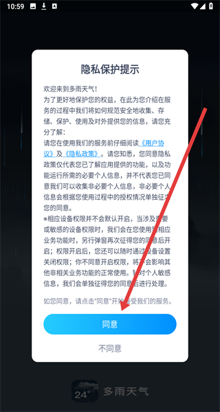 1、在多雨天气的“隐私保护提示”弹窗点击“同意”,进入地址管理页面。
