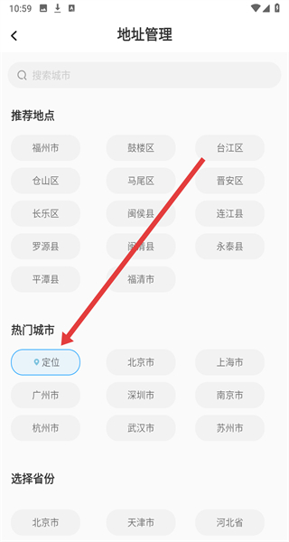 2、在地址管理页面点击“定位”,获取当前位置福州天气。