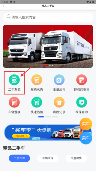1、打开二手车交易类应用,点击精品二手车选项,进入精品二手车页面。