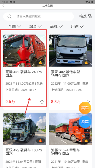 3、在二手车源列表页面,找到豪瀚4×2载货车240PS国五车辆条目,点击进入车辆信息页。