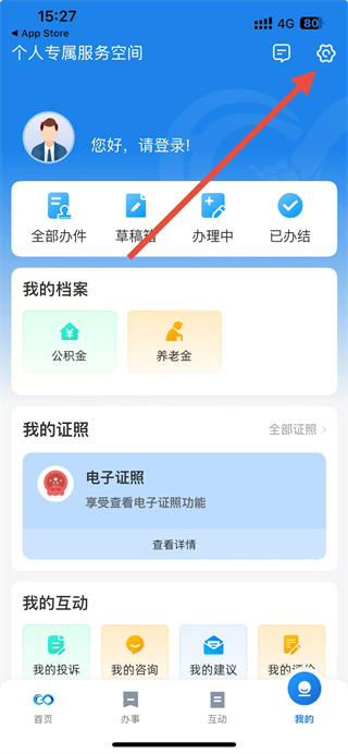 2、在个人专属服务空间页面点击右上角的设置图标,进入设置页面。