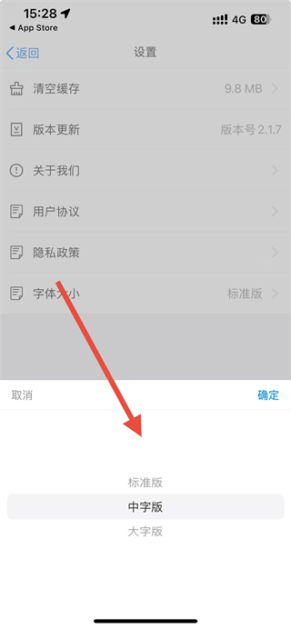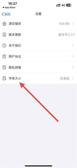 3、在设置页面点击字体大小选项,弹出字体大小选择菜单。