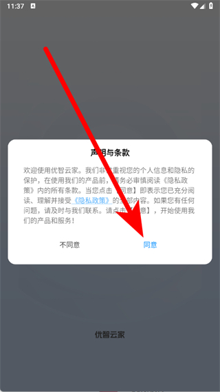 1、打开优智云家,在声明与条款弹窗,点击同意。