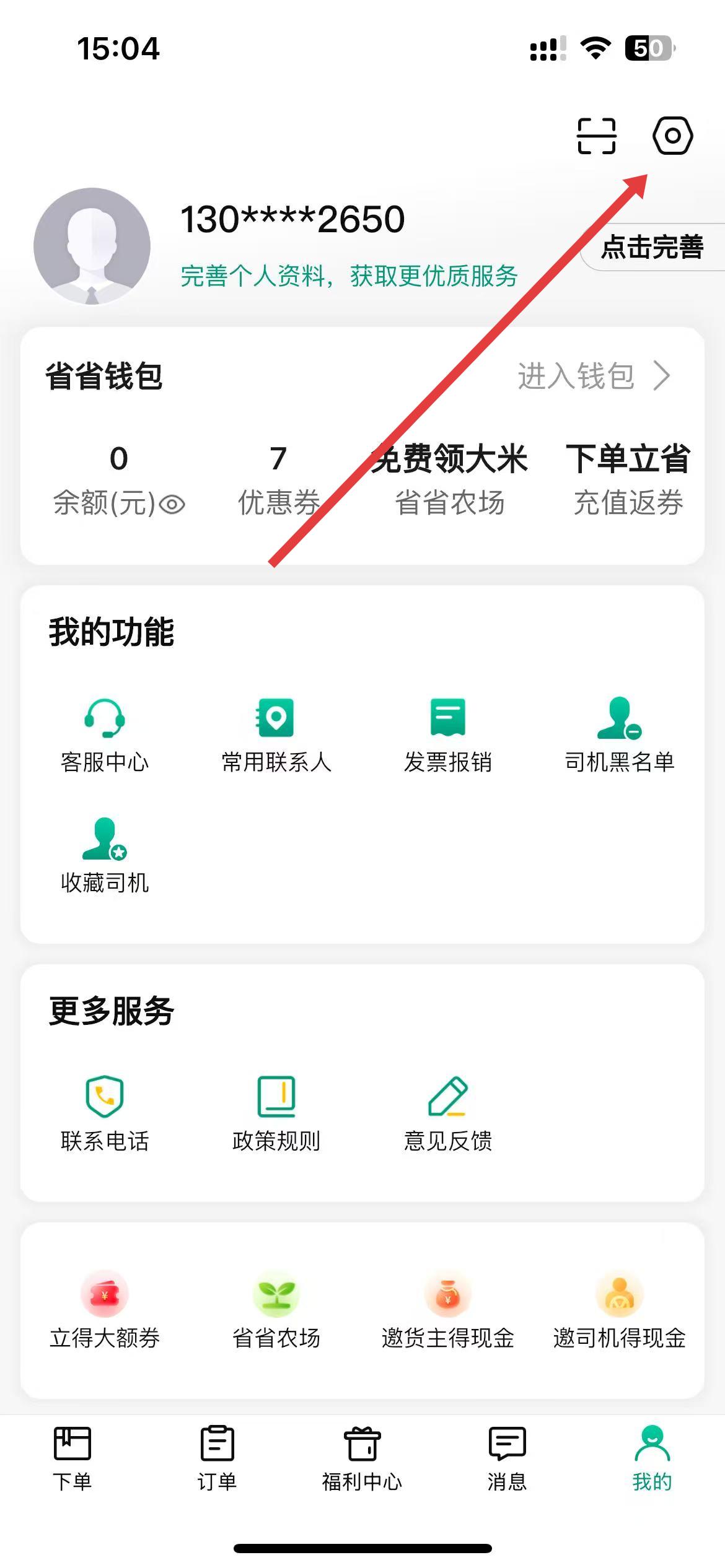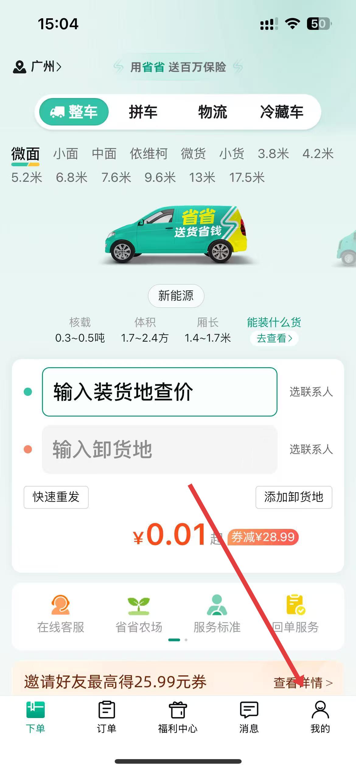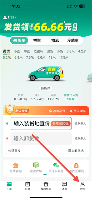 1、打开省省回头车app,进入主界面,点击底部导航栏中的我的图标,进入个人界面。