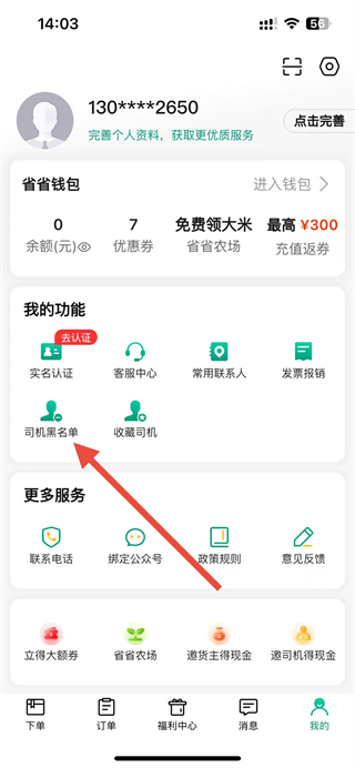 2、在个人中心页面的我的功能板块中,找到司机黑名单选项并点击。