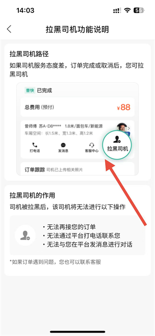 4、在订单页面找到对应司机,点击拉黑司机按钮,即可完成司机拉黑操作。