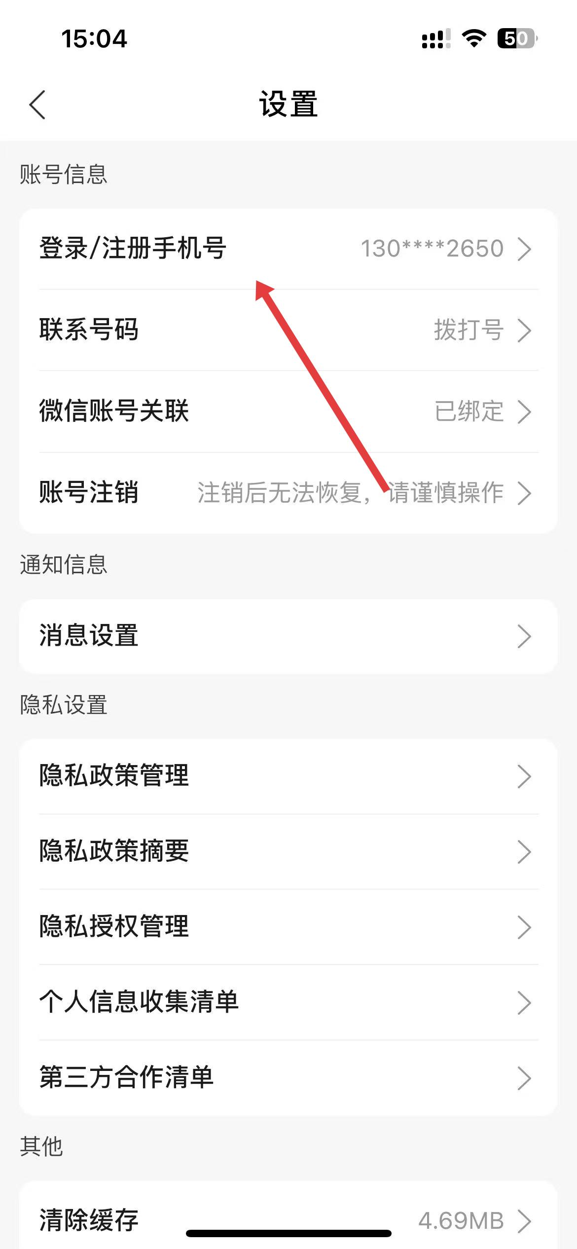 3、在设置页面里,找到登录注册手机号选项并点击,进入更换手机号相关界面。