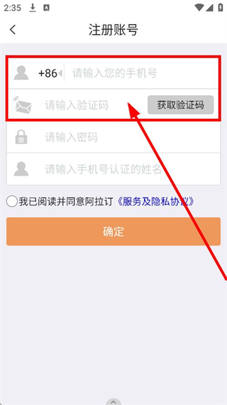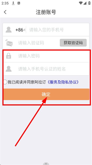 5、随后设置密码、输入手机号认证的姓名,点击确定,完成账号注册操作。