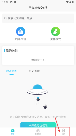 1、打开西海岸公交e行APP首页,点击底部我的选项,进入个人中心页面。