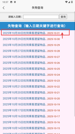3、在失物查询页面,点击2025年10月30日捡到乘客遗留物品条目,进入失物详情页。