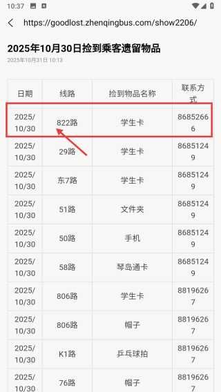 4、在失物详情页,查看822路学生卡的联系方式86852666,获取失物招领信息。