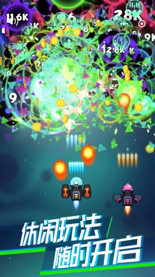 游戏完美融合了消除玩法和射击元素,提供多种竞技模式和无尽挑战,满足不同玩家的需求。经典的街机射击体验搭配现代化特效,玩家可以收集各种强力道具,如范围伤害炸弹、散射强化和速度提升等。竖屏操作设计让游戏更加便捷,数百个精心设计的关卡等待挑战,华丽的爆炸特效和粒子效果带来视觉盛宴。辅助武器的解锁机制独具匠心,随着游戏深入,弹幕效果会越来越炫酷,最终实现全屏弹幕的震撼场面。随机道具系统为游戏增添了更多变数,无论是呼叫支援、火力增强还是金币翻倍,都能带来意想不到的战斗转机。