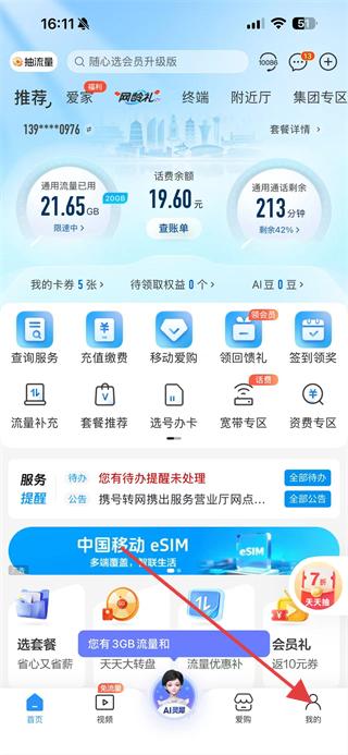 1、打开中国移动甘肃APP,点击右下角我的,进入个人页面。