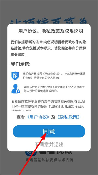 1、在隐私政策及权限说明弹窗中,点击同意,进入首页。