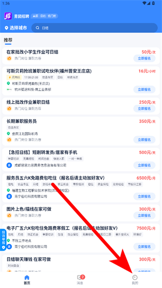 1、打开青团招聘APP,点击右下角我的,进入个人页面。
