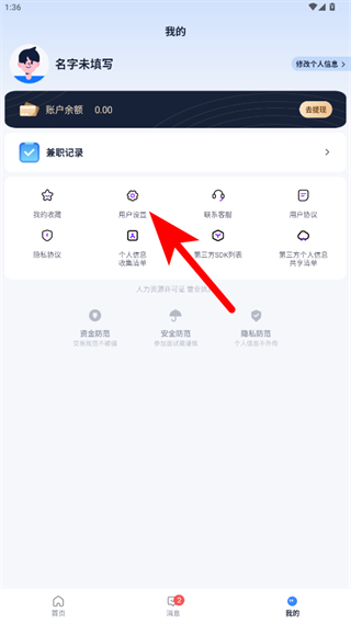 2、在个人页面中,点击用户设置选项,进入设置界面。