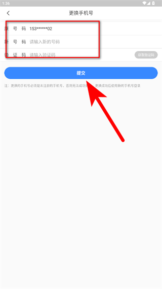 5、在更换手机号界面,输入新手机号码和验证码后,点击提交按钮,即可完成手机号更换。