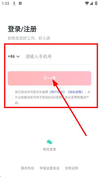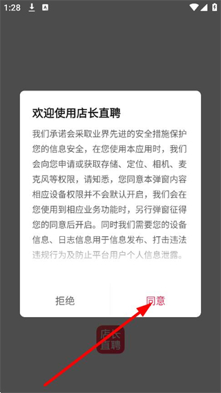 1、在欢迎使用店长直聘弹窗中,点击同意,进入登录/注册页面。