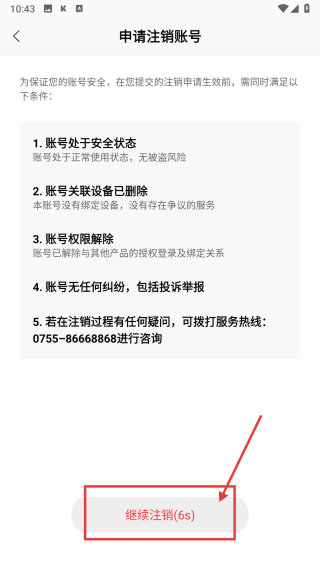 4、在申请注销账号页面,点击继续注销按钮,完成账号注销操作。