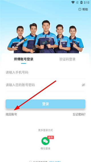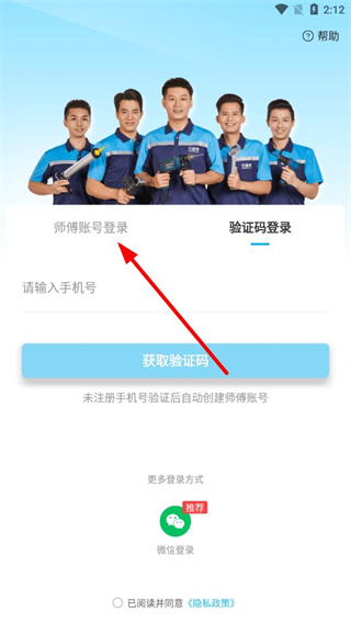 1、打开万师傅APP,在登录页面点击师傅账号登录选项。