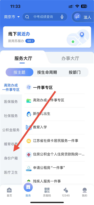 2、在服务页面中,点击身份户籍选项。