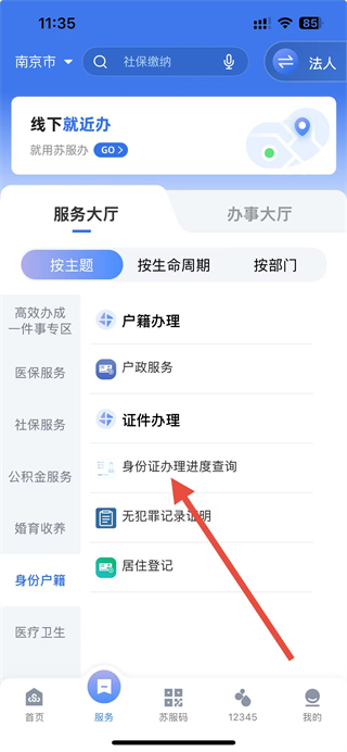 3、进入身份户籍页面后,点击身份证办理进度查询选项。