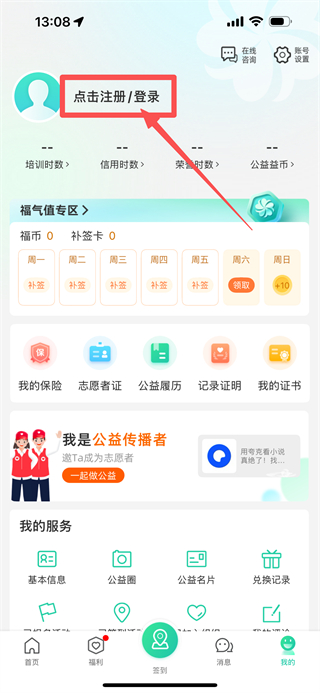 2、在个人页面,点击点击注册/登录,进入登录注册页面。