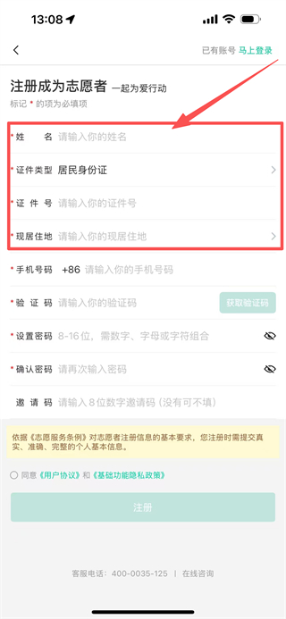4、在注册成为志愿者页面,填写姓名、证件类型、证件号、现居住地等必填信息。