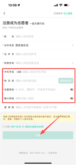 5、随后填写手机号码、验证码、密码等信息,勾选后点击注册,完成账号注册操作。