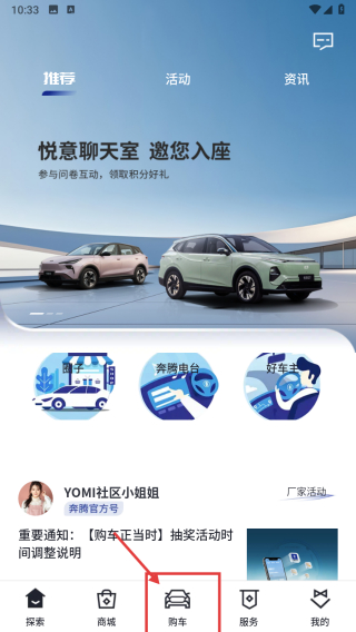 奔腾YOMI是专为奔腾车主打造的一站式汽车服务工具,将车辆与用户生活紧密连接,带来全新用车体验,它支持在线购车、查询附近经销商、预约试乘试驾,还能获取最新车型资讯,满足从选车到用车的全流程需求,同时汇聚海量汽车相关内容,方便用户查阅品牌动态与产品信息,更创新推出车主圈子功能,兼顾车辆服务与情感互动,满足车主多维诉求。