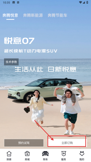 2、在购车板块页面,点击立即订购选项,进入车型选择页面。
