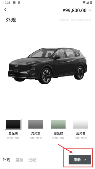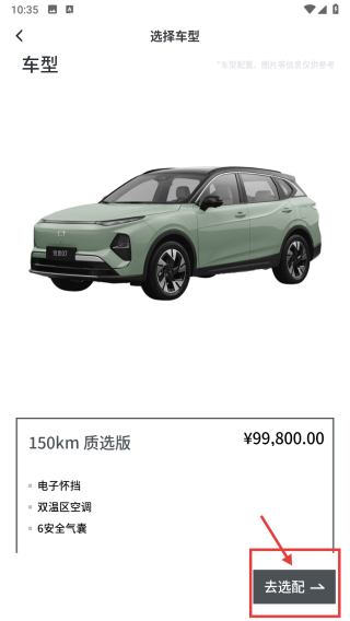 3、在车型选择页面,点击去选配按钮,进入外观配置页面。