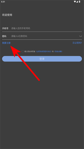1、打开云柜快递员APP,在登录页面点击我要注册,进入注册界面。