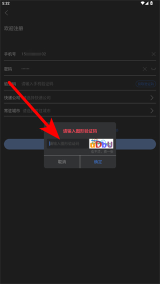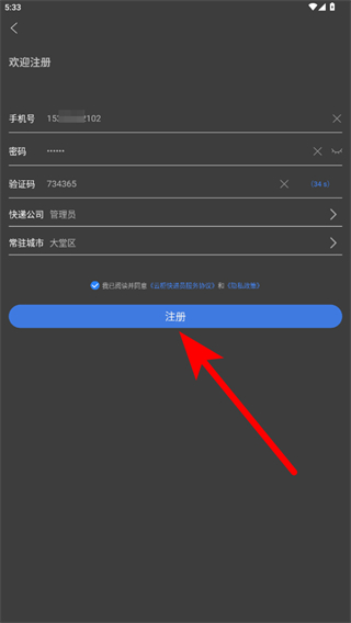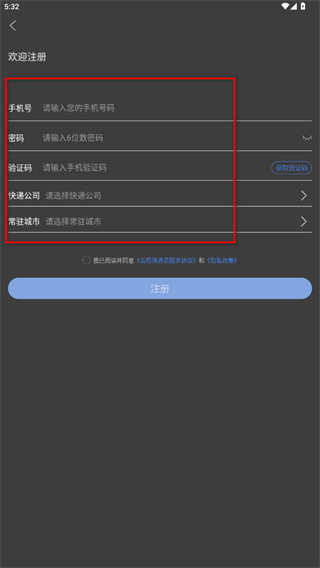 2、在注册界面填写手机号、密码,获取并输入手机验证码,选择快递公司和常驻城市。