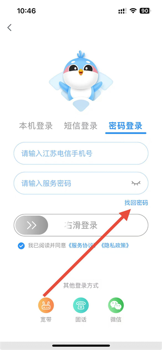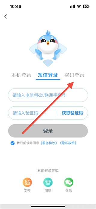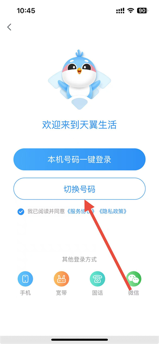 1、打开天翼生活APP,在登录页面点击切换号码。