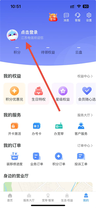 1、打开天翼生活APP,在我的页面点击点击登录。