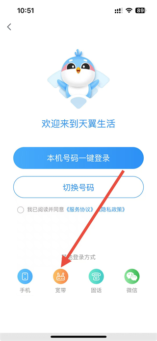 2、在登录方式选择页面,点击宽带选项。